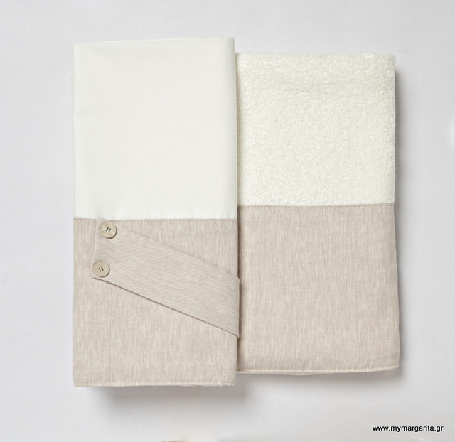 Βαμβακερά λαδόπανα σε ιβουάρ χρώμα με φάσα στο τελείωμα μπέζ καφέ με ιδιαίτερο σχέδιο και κουμπάκια. Τα λαδόπανα περιλαμβάνουν μεγάλη πετσέτα και σεντόνι , πετσέτα μικρη και εσώρουχα .