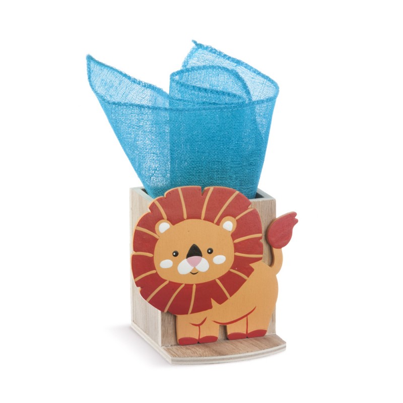 Ξύλινη μολυβοθήκη σε natural χρώμα. Είναι διακοσμημένη με ξύλινη παράσταση λιοντάρι σε αποχρώσεις του σομόν και του κόκκινου.