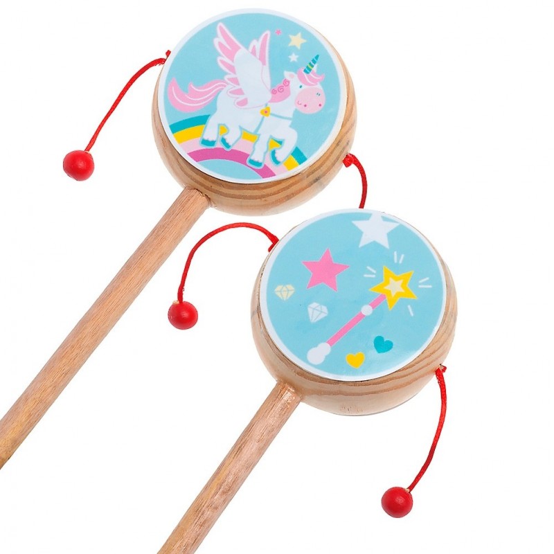 Ξύλινο natural τυμπανάκι. Είναι διακοσμημένο με αυτοκόλλητο print μονόκερος σε σιέλ-ροζ αποχρώσεις και από τις δυο όψεις.