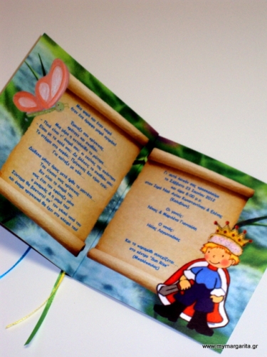 Προσκλητήριο βάπτισης σε μορφή παραμυθιού 4 σελίδων, δεμένο με σατέν κορδέλες.