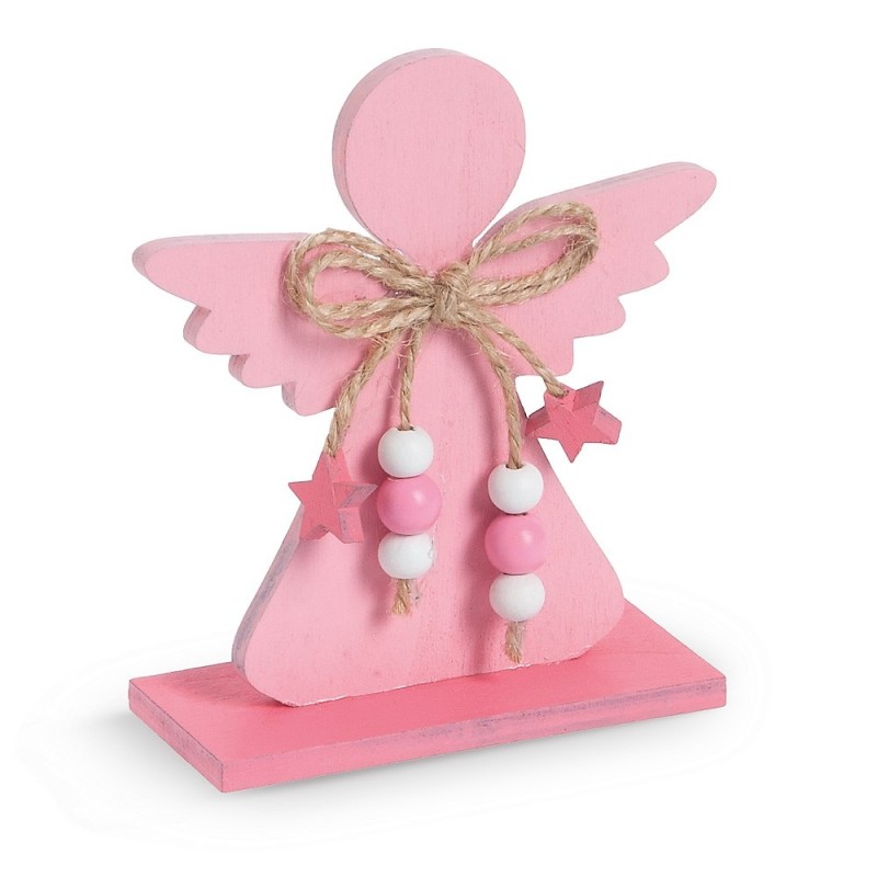 Ξύλινο διακοσμητικό αγγελάκι με βάση σε χρώμα ροζ. Είναι διακοσμημένο με σχοινί φιογκάκι και κρεμαστές ξύλινες χάντρες-αστεράκια σε λευκό-ροζ χρώμα.