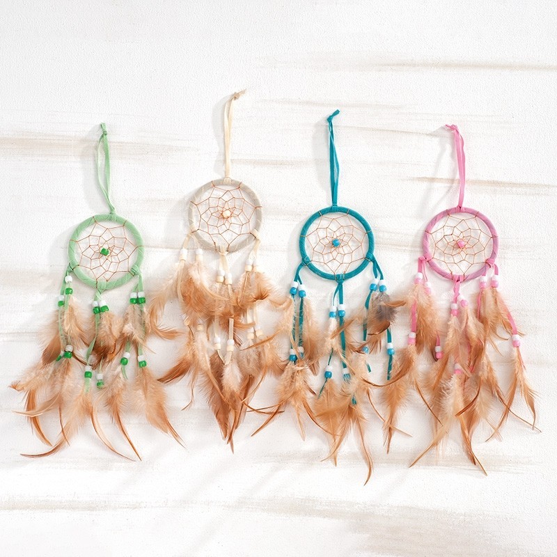 Υφασμάτινη κρεμαστή διακοσμητική πλεκτή ονειροπαγίδα. Διακοσμείται με κρεμαστά φτερά και χάντρες. Ιδανική για ethnic στολισμούς και διακοσμήσεις.