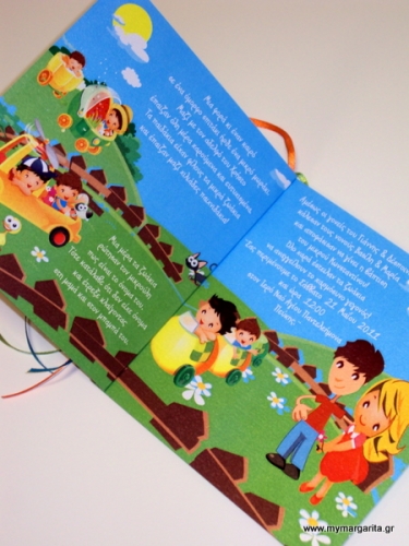 Προσκλητήριο βάπτισης σε μορφή παραμυθιού 4 σελίδων, δεμένο με σατέν κορδέλες.